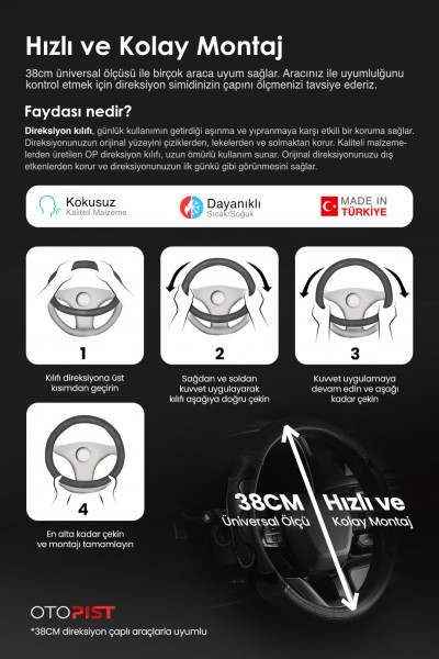 Direksiyonunuzu Korur: Günlük kullanımın getirdiği aşınma ve yıpranmaya karşı etkili bir koruma sağlar. Direksiyonunuzun orijinal yüzeyini çiziklerden, lekelerden ve solmaktan korur.
